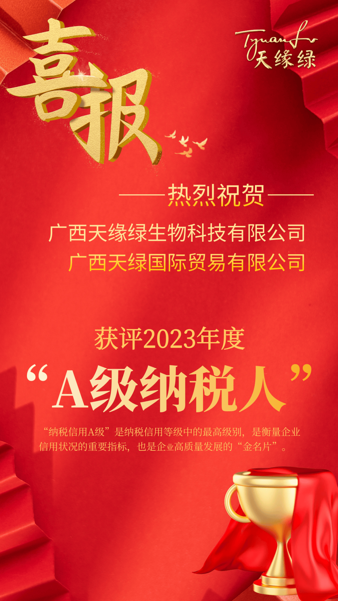 喜報(bào)!天緣綠集團(tuán)母公司及子公司獲評(píng)2023年度納稅信用A級(jí)納稅人
