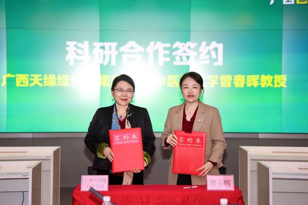 ▲ 廣西天緣綠科技集團(tuán)與廣西中醫(yī)藥大學(xué)曾春暉教授進(jìn)行科研合作簽約