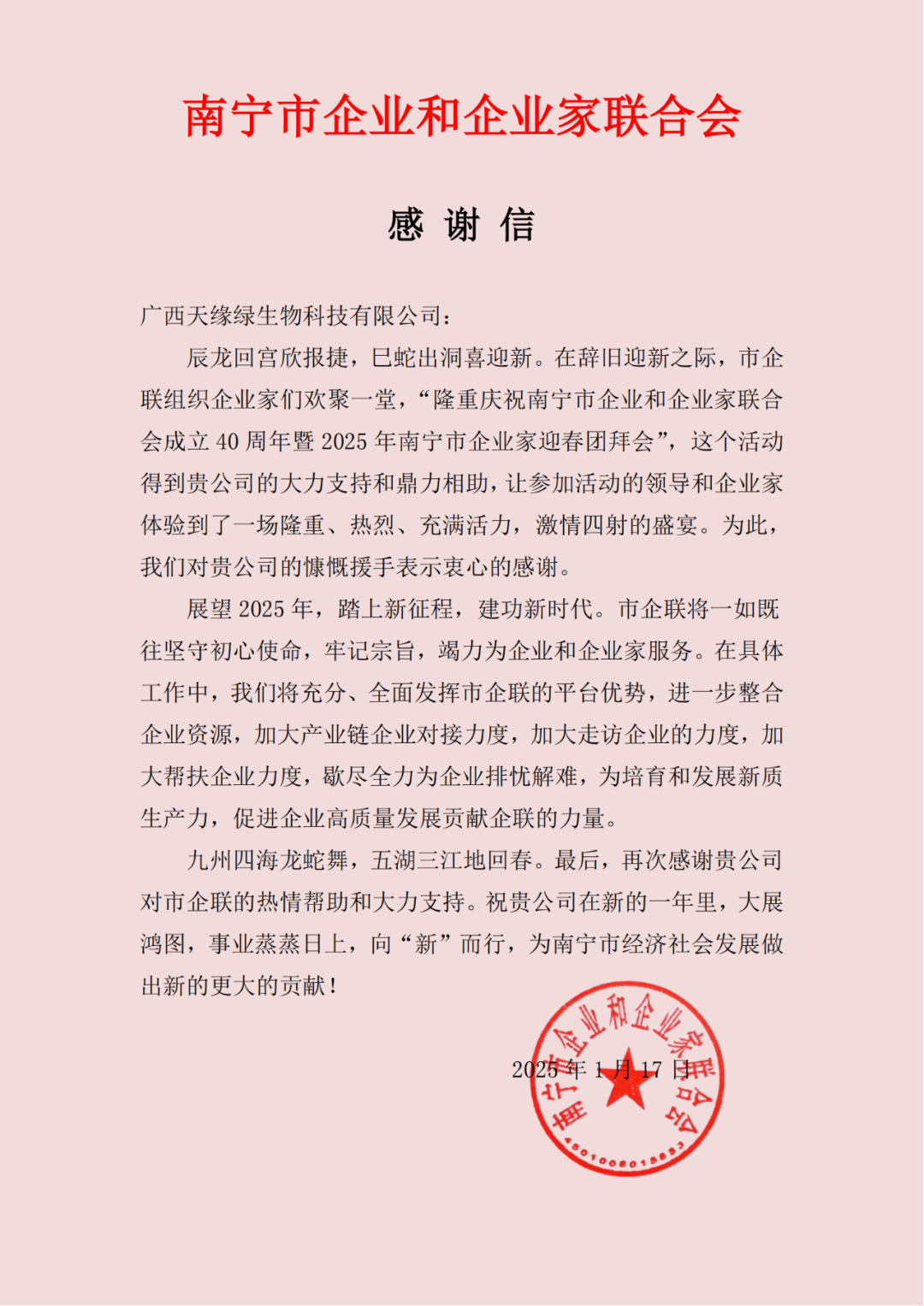 近日,廣西天緣綠科技集團收到了南寧市企業(yè)和企業(yè)家聯(lián)合會(簡稱“南寧市企聯(lián)”)的深情感謝信,信中對天緣綠集團在“南寧市企聯(lián)成立40周年暨2025年南寧市企業(yè)家迎春團拜會”中的慷慨支持與鼎力相助表達了由衷的感激。此次活動在天緣綠集團的助力下,不僅取得了圓滿成功,更讓每一位參與其中的領(lǐng)導(dǎo)和企業(yè)家深切感受到了市企聯(lián)的熱情與蓬勃活力。