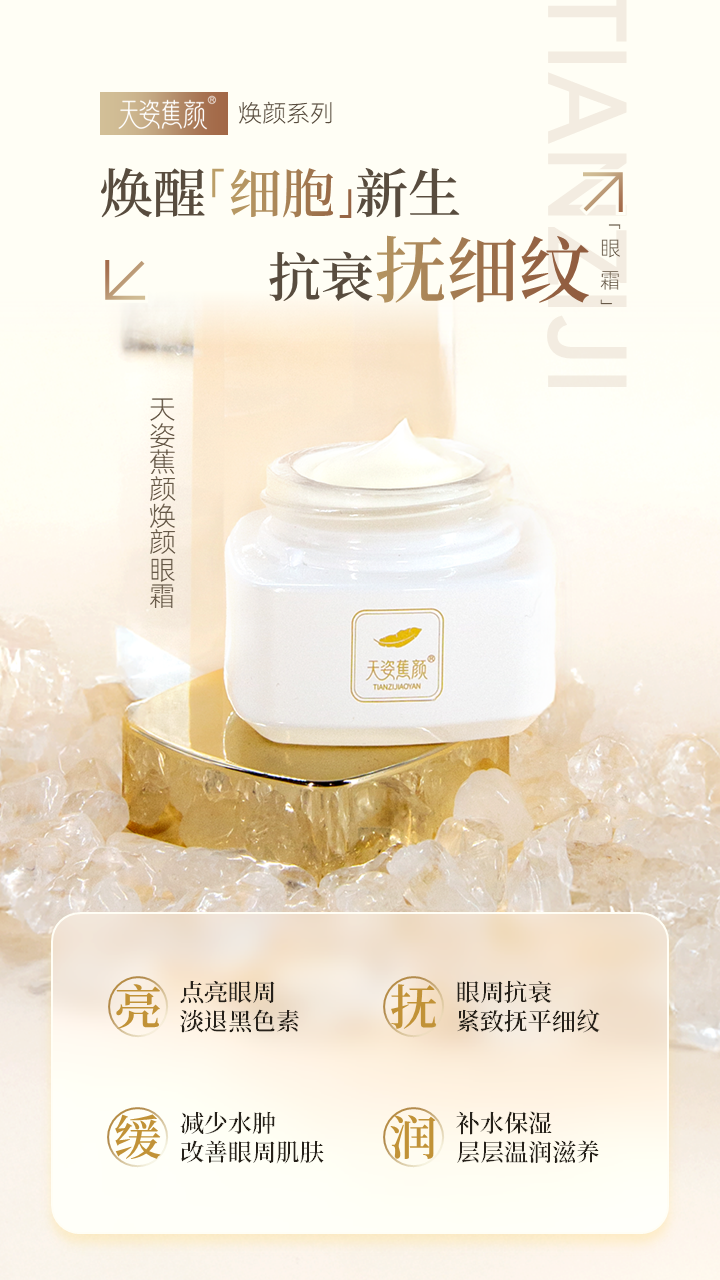 天姿蕉顏煥顏眼霜 醫(yī)美系列產(chǎn)品 閱讀 2024-01-18 天姿蕉顏煥顏眼霜,蘊(yùn)含麥角硫因、依克多因、類蛇毒肽等珍貴抗衰修護(hù)成分,同時甄選天然植物大蕉果、蘆薈、甘草根、當(dāng)歸根、山茱萸果等多種植萃精華。